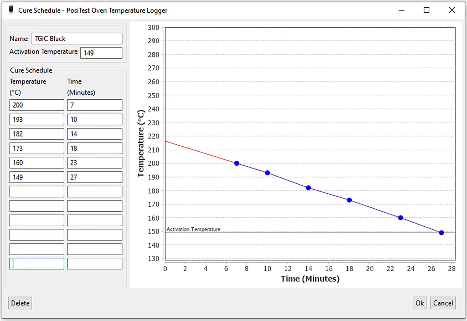 In the Curing Schedule Editor, enter the powder manufacturer's recommended specifications for the curing schedule or curing curve. In addition to the activation temperature, time/temperature pairs (up to 12 pairs) can be entered. The activation temperature (minimum temperature for curing) is the minimum temperature specified by the manufacturer at which curing should begin. If no activation temperature is added, the lowest time/temperature specification is assumed as the activation temperature.