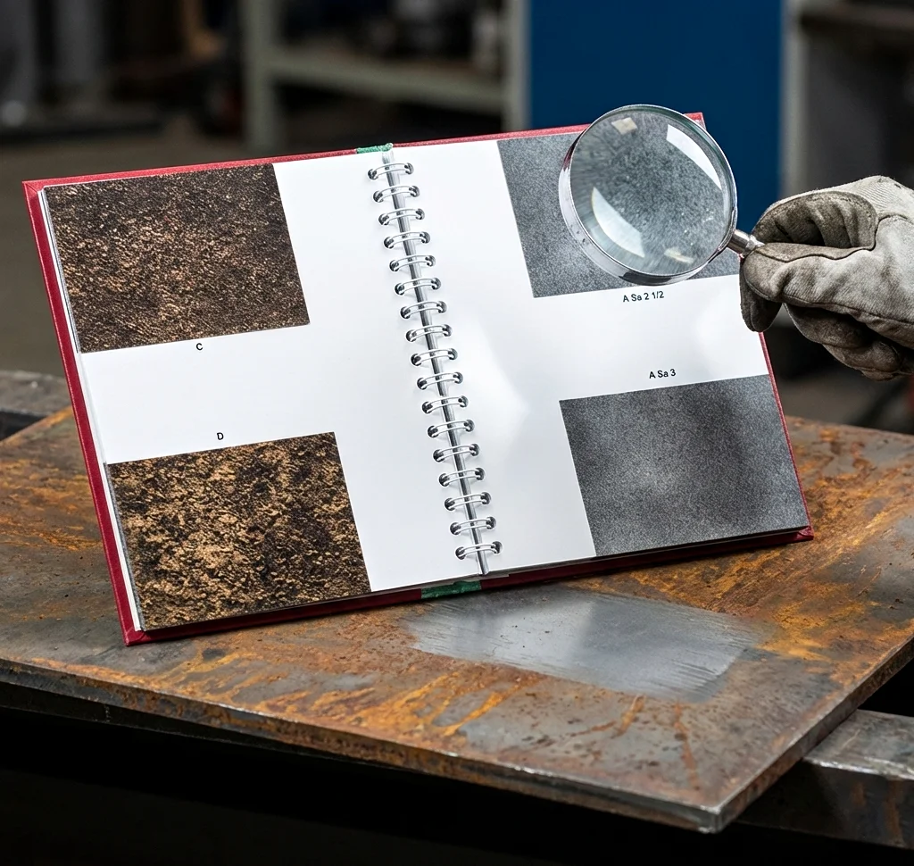 Warum ist das Original-Fotovergleichsmuster notwendig? Bei der visuellen Beurteilung der Oberflächenreinheit entscheiden Nuancen in Farbe und Textur über die Qualität der Untergrundvorbehandlung. Nur das Original-Druckwerk der ISO 8501-1 bietet die farbverbindliche Referenz, die für Abnahmen durch FROSIO- oder NACE-Inspektoren anerkannt wird.